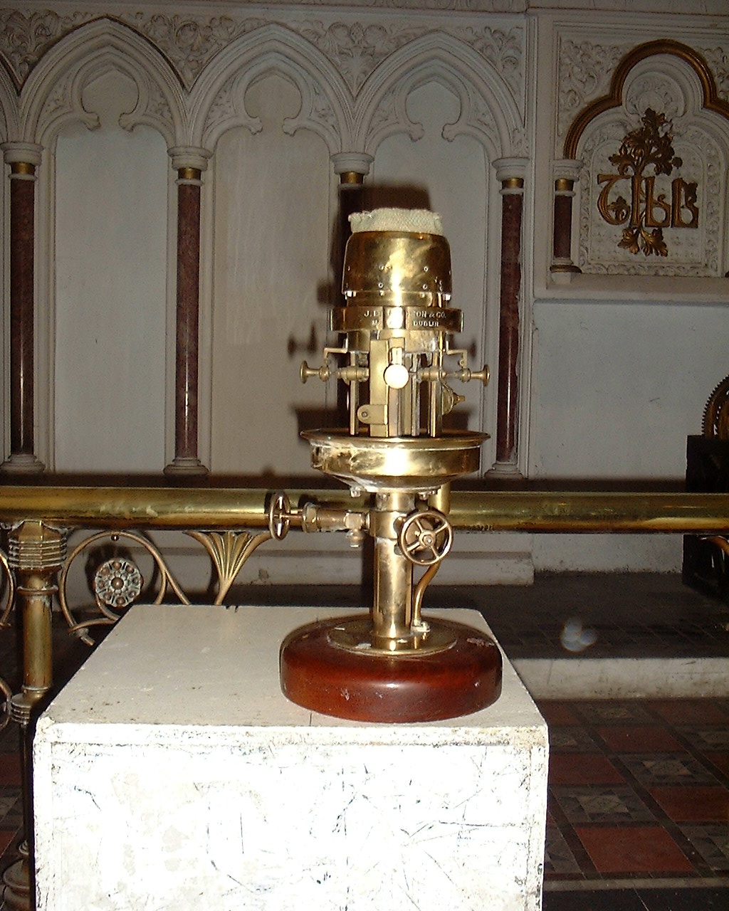 It was Wigham who came up with this simple yet extremely useful invention. Wigham came up with many types of oil lamps. He was constantly seeking a reliable brighter flame. Some of these were for different types of lamp oil, prior to paraffin (kerosene). He came up with the idea of concentric circular wicks. This example has four such circular wicks. He used similar ideas with his later gas lights, which became known as "crocus lights‟.   With his experience of gas lights used from the gas generators he was supplying to buildings he concluded that gas light was far brighter than the oil lamps then used in light houses. He came up with a design and presented it to the Dublin Ballast Board in 1862.