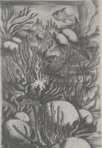The helmet sat on the shoulders and had lead weights attached to keep it in position. Robert's accounts of his first dives with the equipment are hilarious. He was helped into the water at the ladder on the pier by Mr. Whitfield, the director of the Station. As I stepped down that ladder with the noise of the pump echoing down the hose-pipe, and the waves splashing against the window of the helmet so that I could see neither land nor water, I wondered why I had ever left home. But once below the surface my feelings changed. My ears ceased throbbing, I breathed easily, I forgot the noise of the pump and I could see easily. From the hard rung of the ladder I stepped onto the soft ooze of the sea-floor. It was like being in some great cathedral lit by pale green glass. Robert had difficulty staying on his feet during this first dive and he surfaced. The problem was rectified by Mr Whitfield getting twenty pounds of lead piping and wrapping it around Robert's waist, after which he could walk around the bottom with perfect ease. He had wondered how he would be able to draw underwater and had tried several methods unsuccessfully until a friend at Reading University suggested using sheets of ‘Xylonite', a substance resembling celluloid. When roughened with sandpaper, the sheets accepted pencil drawings comfortably. For pencils he used sticks of graphite encased in rubber tubing. He dived around the reefs on Bermuda and on nearby Coopers Island. His output of underwater art was prolific and in recounting his experiences, his writings are interspersed with a wonderful array of humorous and interesting anecdotes about the locality and its characters. Most of his underwater pictures were subsequently re-worked as woodcuts. Robert had agreed with Penguin Books to write about this journey and several others and his next venture took him to the Red Sea. In the Spring of 1938, Robert travelled via Paris to Marseilles where he boarded a P&O steamer headed for Port Said in Egypt. He seems not to have enjoyed the trip on the ship as he wrote that he was confined in tourist class ‘in the uttermost bowels of the ship in a small cabin.' That Robert had an eye for the ladies is evident in a story that he told about:A fanatical evangelist with a lovely wife. He has tried to convert me to his beliefs, I have tried to convert her to mine, so far, no score on either side.'From there he travelled to Suez by train to catch a small oil tanker heading south. An example of his descriptive prose can be gained from his account of Port Said……