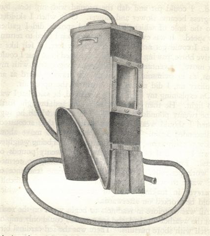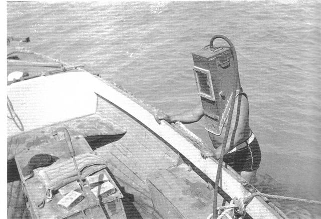 The pressure of the air within the helmet is kept up by the pump, operated from the launch overhead. Provided the man at the job does not go to sleep in the sun, there is sufficient pressure to prevent the water rising above chin level.