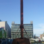 Joe Murphy had taken over as supervisor in the bell from John Reilly, another port shipwright, who had graduated to standard dress diving. When the bell was laid up and John Reilly received further promotion, Joe took over his duties as the port diver, in which capacity he served for several years before eventually becoming a Senior Technical Supervisor. The bell was in danger of being scrapped in the 1980s but due to strongly voiced opinions from many people including Joe Murphy, the decision was made to save this unique artefact for posterity. A large floating crane, the Mersey Mammoth, was on charter in the port and this was used to transport and lift the bell to its present location on Sir John Rogerson’s Quay. The lift and placement of the bell onto a prepared plinth was supervised by Joe Murphy. In 1989, the Dublin Docklands Development Authority decided to donate money to have the bell restored. The Dublin Port Company also contributed to the project. The nearby St. Andrews Resource Centre formed a committee, which included Joe Murphy, now retired, to supervise the refurbishment. The bell was shot blasted and painted inside and out and a viewing port was cut into one side of the bell through the massive eight-inch thick iron plating of the chamber. The access shaft with the airlock was adjudged to be beyond repair and it was faithfully replicated by the Fingal Steel Company. There is a scale model of the bell in the St. Andrews Resource Centre. Although lacking a plaque to explain its original purpose, the bell stands today as a unique piece of industrial archaeology and a testament to the men who built the modern port of Dublin.