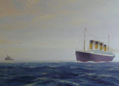 R.M.S. Titanic disembarking pilot off the Daunt Lightvessel, 11th April 1912. Oil painting available from http://www.king-studio.com